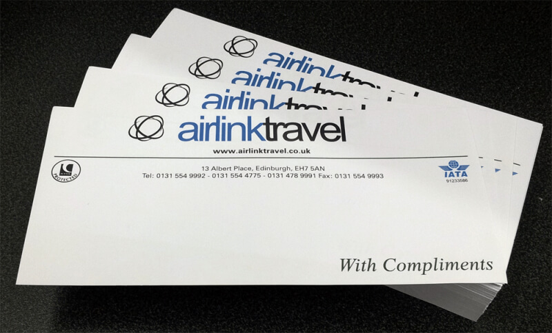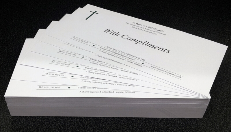 At Crescent Print Edinburgh, compliment slip printing is done in full colour as standard onto 120 gsm premium smooth uncoated paper is used ensuring a high quality finish.
